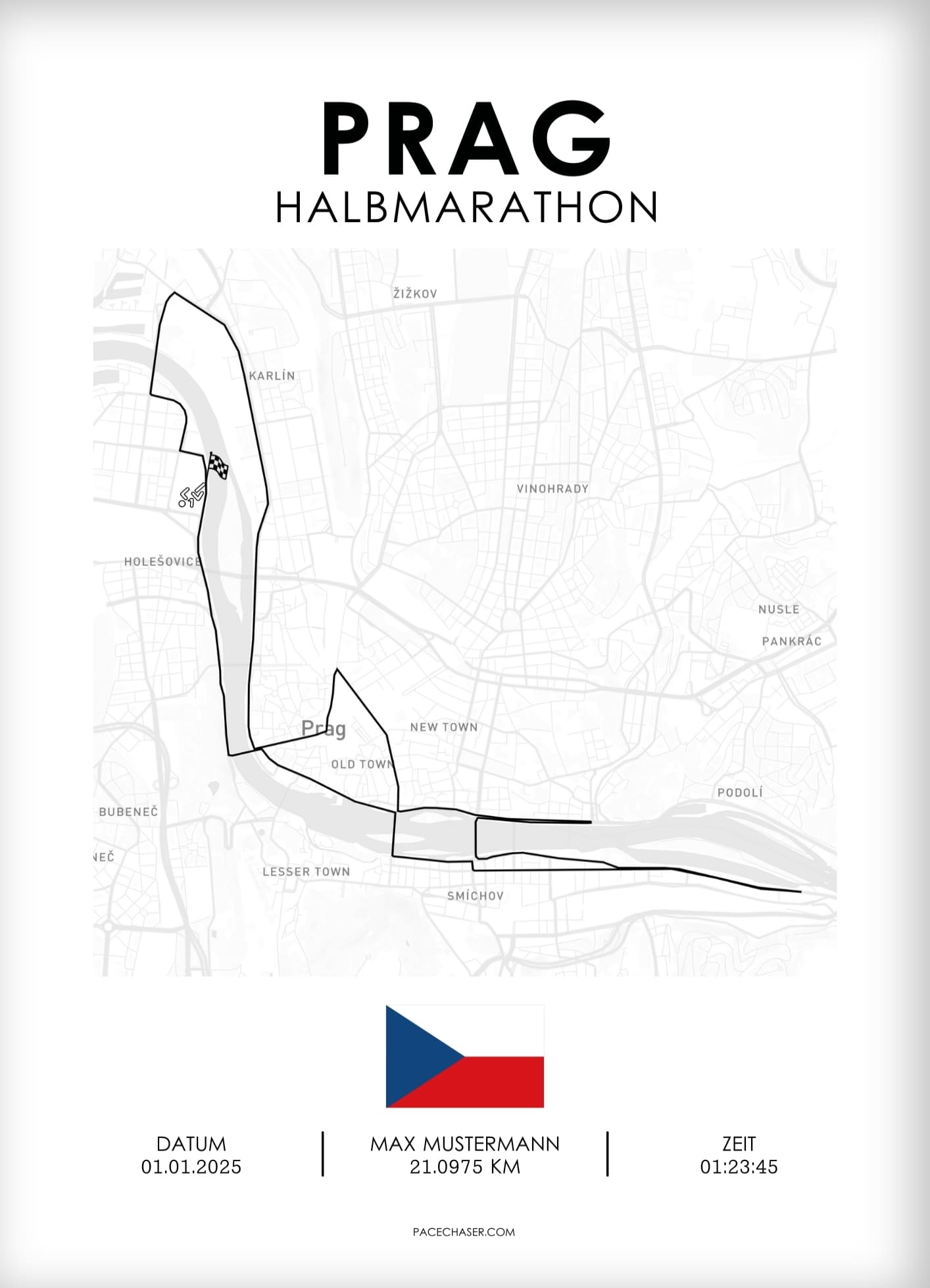 Dein Marathon war mehr als nur Kilometer sammeln – es war eine persönliche Herausforderung, ein unvergesslicher Moment. Mit Pacechaser hältst du die Leistung stilvoll fest: ein individuelles Poster der Laufstrecke, personalisiert mit Namen, Zeit und Datum - verewige deinen oder den Erfolg deiner Liebsten in hochwertigem Design.