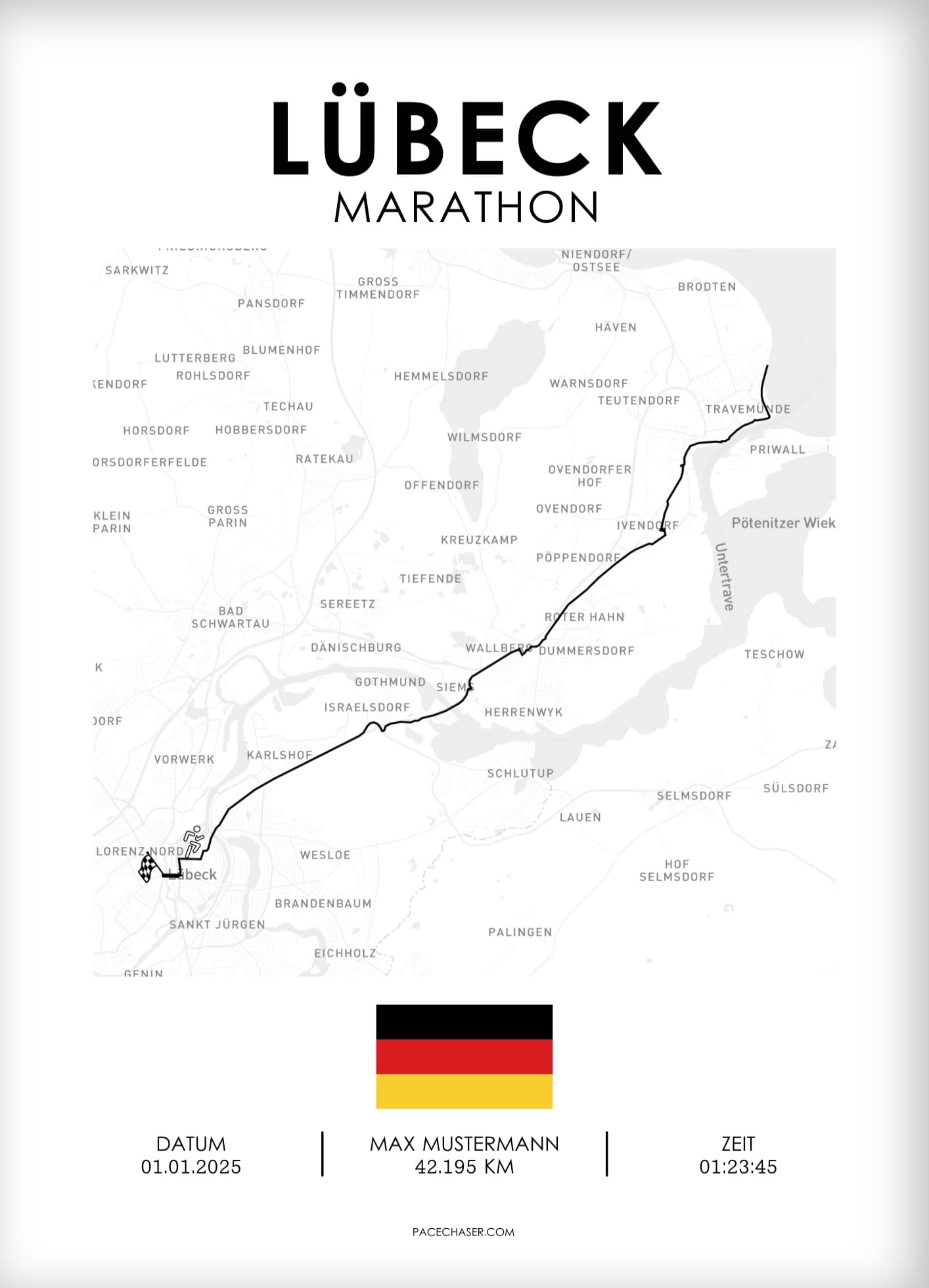 Dein Marathon war mehr als nur Kilometer sammeln – es war eine persönliche Herausforderung, ein unvergesslicher Moment. Mit Pacechaser hältst du die Leistung stilvoll fest: ein individuelles Poster der Laufstrecke, personalisiert mit Namen, Zeit und Datum - verewige deinen oder den Erfolg deiner Liebsten in hochwertigem Design.