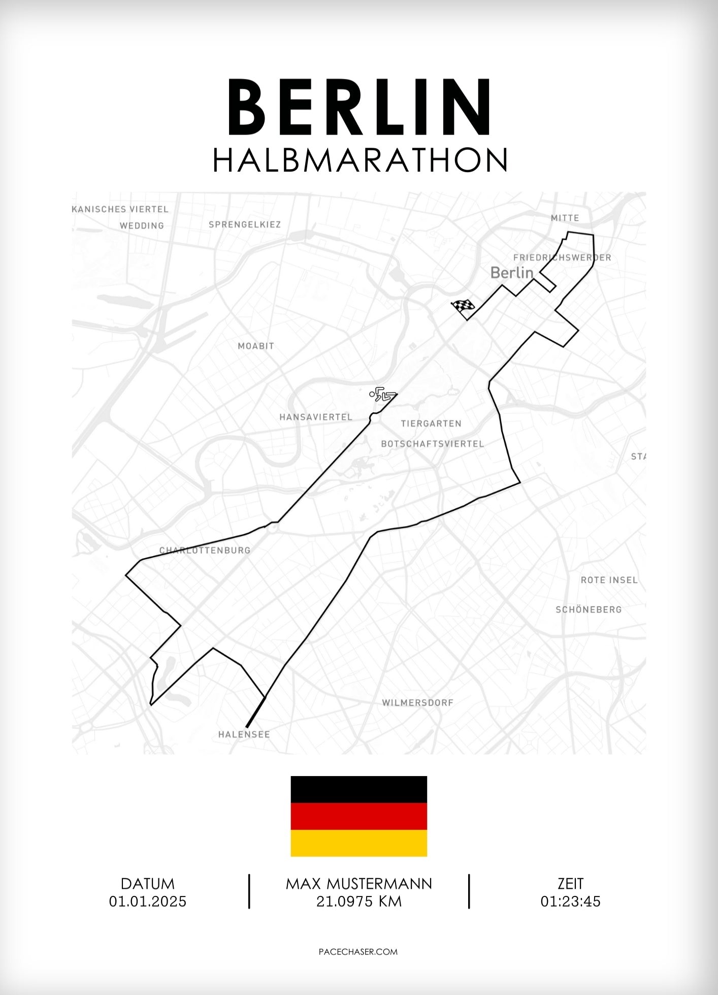 Dein Marathon war mehr als nur Kilometer sammeln – es war eine persönliche Herausforderung, ein unvergesslicher Moment. Mit Pacechaser hältst du die Leistung stilvoll fest: ein individuelles Poster der Laufstrecke, personalisiert mit Namen, Zeit und Datum - verewige deinen oder den Erfolg deiner Liebsten in hochwertigem Design.
