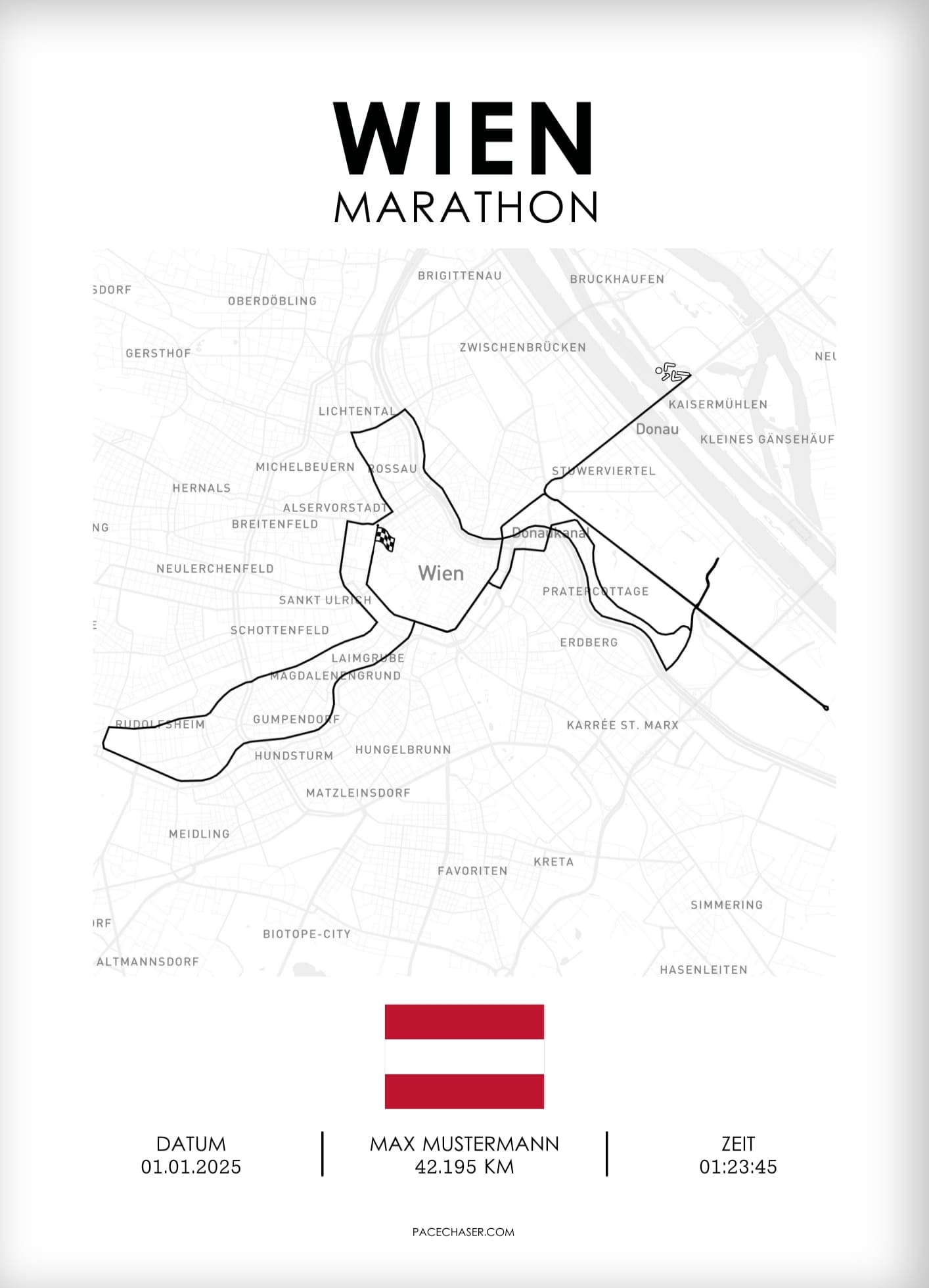 Dein Marathon war mehr als nur Kilometer sammeln – es war eine persönliche Herausforderung, ein unvergesslicher Moment. Mit Pacechaser hältst du die Leistung stilvoll fest: ein individuelles Poster der Laufstrecke, personalisiert mit Namen, Zeit und Datum - verewige deinen oder den Erfolg deiner Liebsten in hochwertigem Design.